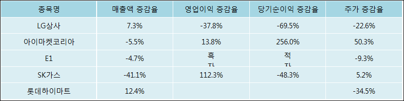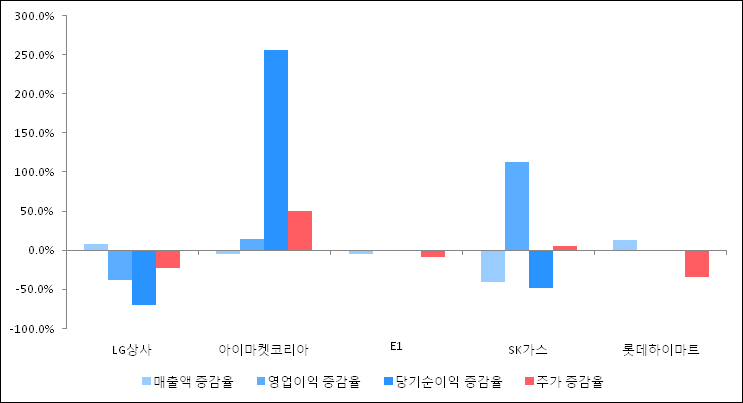 다음은 LG상사와 동일 업종 내 비교 그룹 종목의 각각 최근 실적의 전년 동기 대비 성장률이다. LG상사의 매출액 증감율은 타 종목 대비 우수한 편이다. 그리고 주가의 하락율이 비교적 큰 편으로 나타났다.