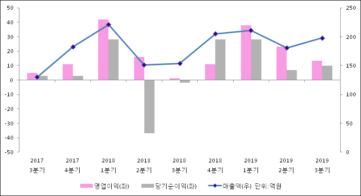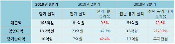 11월 14일 이지웰페어(090850)의 2019년 3분기 연결 확정 실적이 발표됐다. 매출액은 작년 동기 대비해서 28.6% 증가하여 198억원을 달성했다. 영업이익은 2170.69% 증가하여 13.2억원을 달성했다. 당기순이익은 -1.7억원에서10억원으로 흑자전환되었다.