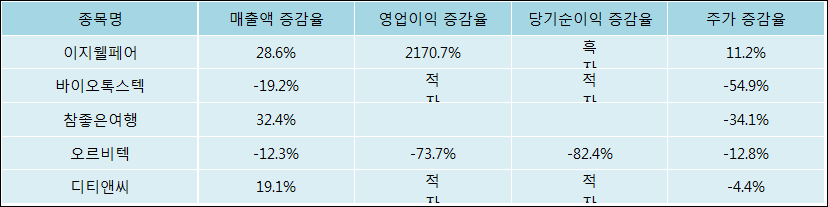 다음은 이지웰페어와 동일 업종 내 비교 그룹 종목의 각각 최근 실적의 전년 동기 대비 성장률이다. 이지웰페어의 매출액 증감율은 타 종목 대비 우수한 편이다. 그리고 주가는 가장 높은 상승률을 보였다.