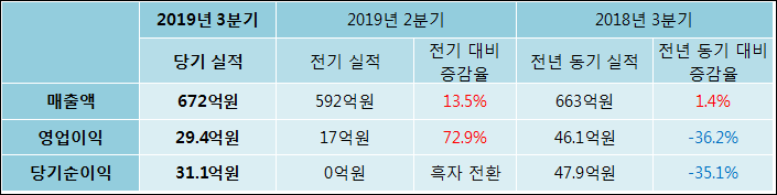 11월 14일 삼진엘앤디(054090)의 2019년 3분기 연결 확정 실적이 발표됐다. 전년 같은 기간 대비 매출액은 1.35% 증가한 672억원으로 집계됐다. 그러나 영업이익과 당기순이익은 36.2%, 35.06%씩 축소되어 29.4억원, 31.1억원으로 발표됐다.