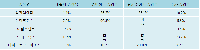 다음은 삼진엘앤디와 동일 업종 내 비교 그룹 종목의 각각 최근 실적의 전년 동기 대비 성장률이다. 삼진엘앤디의 매출액은 증가했지만 증감율은 타 종목 대비 저조한 편이다. 그리고 주가의 하락율이 비교적 큰 편으로 나타났다.