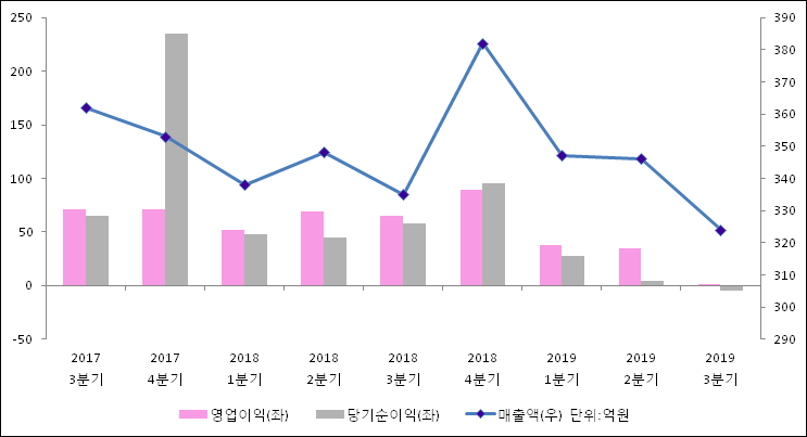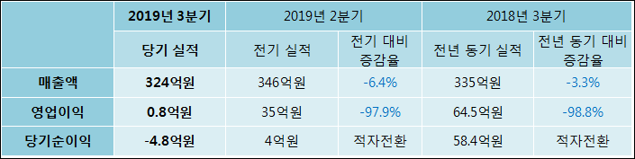 11월 14일 SKC솔믹스(057500)의 2019년 3분기 연결 확정 실적이 발표됐다. 매출액은 작년 같은 기간 대비해서 3.28% 감소하여 324억원라고 발표됐다. 영업이익은 98.84% 감소하여 0.8억원라고 발표됐다. 당기순이익은 -4.8억원으로 58.4억원에서 적자전환되었다.