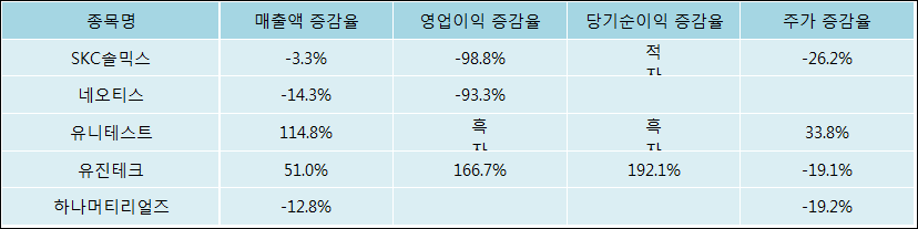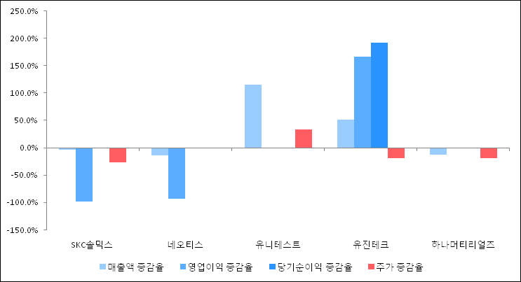 다음은 SKC솔믹스와 동일 업종 내 비교 그룹 종목의 각각 최근 실적의 전년 동기 대비 성장률이다. SKC솔믹스의 매출액은 감소했지만 증감율은 타 종목 대비 양호한 편이다. 그리고 주가의 하락율이 가장 큰 편으로 나타났다.