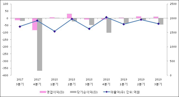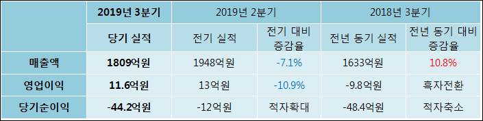 11월 14일 모베이스전자(012860)의 2019년 3분기 연결 확정 실적이 발표됐다. 작년 같은 기간 대비해서 매출액은 10.77% 늘어나서 1809억원을 기록했다. 영업이익은 -9.8억원에서 11.6억원으로 흑자전환되었다. 당기순이익은 -48.4억원에서-44.2억원으로 적자축소되었다고 발표했다.