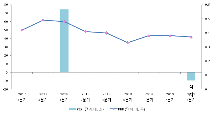 주가가 1주당 순자산의 몇배인지 알려주는 주가순자산비율인 PBR은 0.37배이다. 지난해 동기 PBR은 0.4배로 이번 분기와 비슷한 수치이다.
