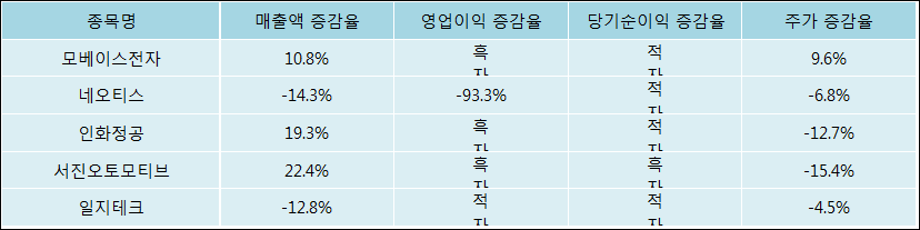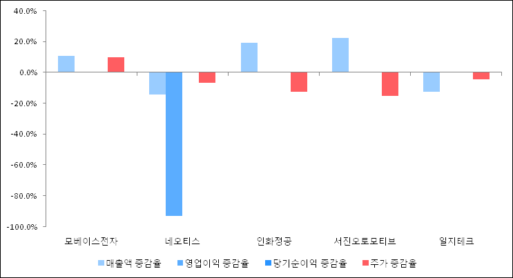 다음은 모베이스전자와 동일 업종 내 비교 그룹 종목의 각각 최근 실적의 전년 동기 대비 성장률이다. 모베이스전자의 매출액 증감율은 타 종목 대비 양호한 편이다. 그리고 주가는 가장 높은 상승률을 보였다.