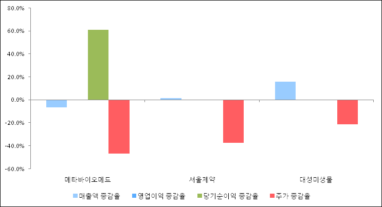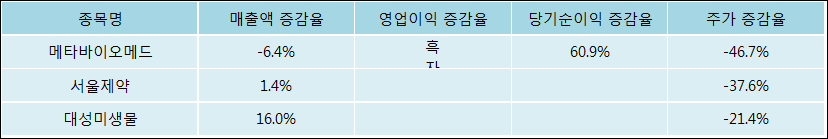 다음은 메타바이오메드와 동일 업종 내 비교 그룹 종목의 각각 최근 실적의 전년 동기 대비 성장률이다. 메타바이오메드의 매출액 증감율은 타 종목 대비 저조한 편이다. 그리고 주가의 하락율이 비교적 큰 편으로 나타났다.