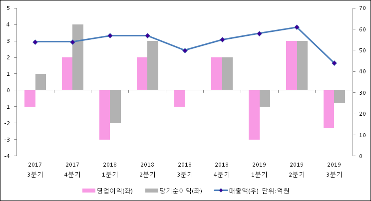 11월 14일 태원물산(001420)의 2019년 3분기 개별 확정 실적이 발표됐다. 매출액은 전년 같은 기간 대비해서 10.53% 감소하여 44억원라고 발표됐다. 영업이익은 -2.3억원으로 -1억원에서 적자폭이 확대되었다.