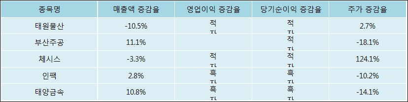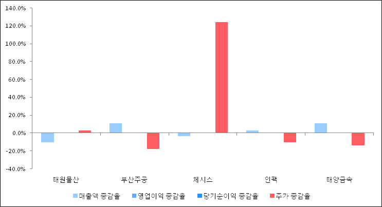 다음은 태원물산과 동일 업종 내 비교 그룹 종목의 각각 최근 실적의 전년 동기 대비 성장률이다. 태원물산의 매출액 증감율은 타 종목 대비 가장 저조한 편이다. 그리고 주가 상승률은 높은 편이다.