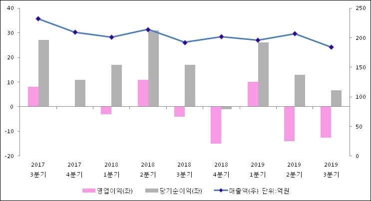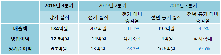 11월 14일 삼성공조(006660)의 2019년 3분기 연결 확정 실적이 발표됐다. 작년 동기 대비해서 매출액은 4.16% 줄어들어 184억원을 기록했다. 영업이익은 -12.5억원으로 -4억원에서 적자폭이 확대되었다. 당기순이익은 59.53% 감소하여 6.7억원라고 발표됐다.