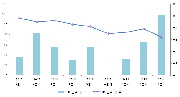 주가가 1주당 수익의 몇배가 되는지 나타내는 주가수익비율(PER)은 117.5배로 나타났다. 전년 동기 PER은 55.36배로 이번 분기에 상승했다.주가가 1주당 순자산의 몇배인지 알려주는 주가순자산비율인 PBR은 0.32배이다. 지난해 동기 PBR은 0.41배로 이번 3분기 PBR이 하락했다.