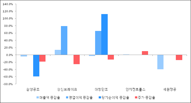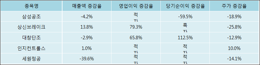 다음은 삼성공조와 동일 업종 내 비교 그룹 종목의 각각 최근 실적의 전년 동기 대비 성장률이다. 삼성공조의 매출액 증감율은 타 종목 대비 저조한 편이다. 그리고 주가의 하락율이 비교적 큰 편으로 나타났다.