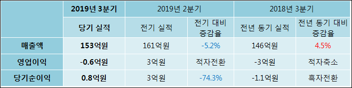 11월 14일 케이씨피드(025880)의 2019년 3분기 연결 확정 실적이 발표됐다. 매출액은 전년 같은 기간 대비해서 4.52% 증가하여 153억원을 달성했다. 영업이익은 -3억원에서 -0.6억원으로 적자폭이 축소되었다고 발표했다. 당기순이익은 -1.1억원에서0.8억원으로 흑자전환되었다.