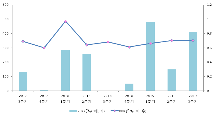주가가 1주당 수익의 몇배가 되는지 나타내는 주가수익비율(PER)은 411.7배로 나타났다. 직전분기 PER은 150배로 이번 분기에 상승했다.주가가 1주당 순자산의 몇배인지 알려주는 주가순자산비율인 PBR은 0.7배이다. PBR은 최근 1년동안 큰 변동 없이 비슷한 수치를 보이고 있다. 지난해 동기 PBR은 0.68배로 이번 분기와 비슷한 수치이다.