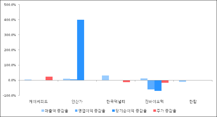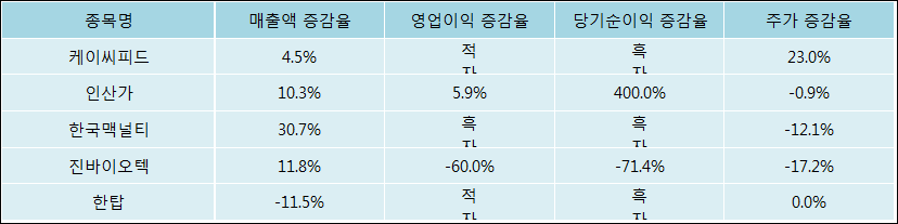 다음은 케이씨피드와 동일 업종 내 비교 그룹 종목의 각각 최근 실적의 전년 동기 대비 성장률이다. 케이씨피드의 매출액은 증가했지만 증감율은 타 종목 대비 저조한 편이다. 그리고 주가는 가장 높은 상승률을 보였다.