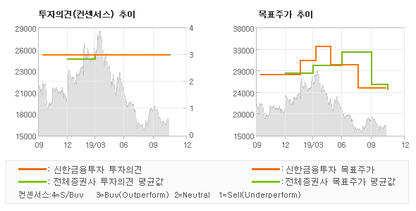 신한금융투자의 동종목에 대한 최근 1년동안의 투자의견은 전체적으로 큰 변화없이 유지되고 있다. 목표주가는 2019년4월 34,000원까지 높아졌다가 2019년8월 25,000원을 최저점으로 목표가가 제시된 이후 최근에도 25,000원으로 제시되고 있다.