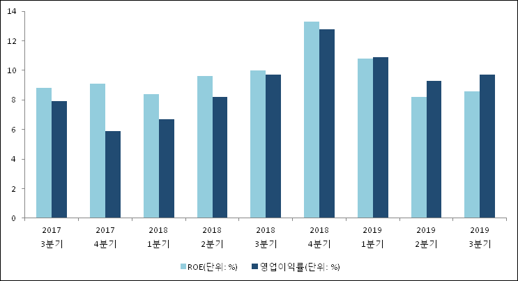 이번분기 기준으로 추정되는 세방전지의 자기자본이익률(ROE)은 8.6%로 나타났다. 전년 동기인 2018년 3분기 ROE는 10%로 이번 분기에 1.4%p 하락했다. 한편 동종목의영업이익률은 9.7%이다. 지난해 동기 영업이익률은 9.7%로 이번 분기와 비슷한 수치이다.