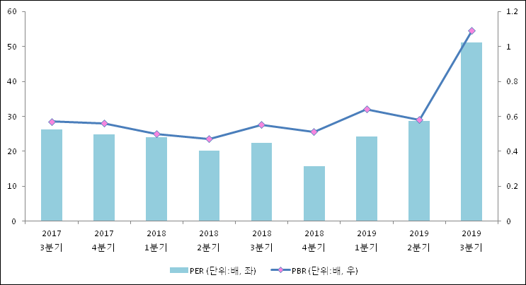 주가가 1주당 수익의 몇배가 되는지 나타내는 주가수익비율(PER)은 51.1배로 나타났다. PER은 최근 3분기 이상 꾸준히 상승하고 있다. 전년 동기 PER은 22.4배로 이번 분기에 상승했다.주가가 1주당 순자산의 몇배인지 알려주는 주가순자산비율인 PBR은 1.09배이다. 지난해 동기 PBR은 0.55배로 이번 3분기 PBR이 상승했다.