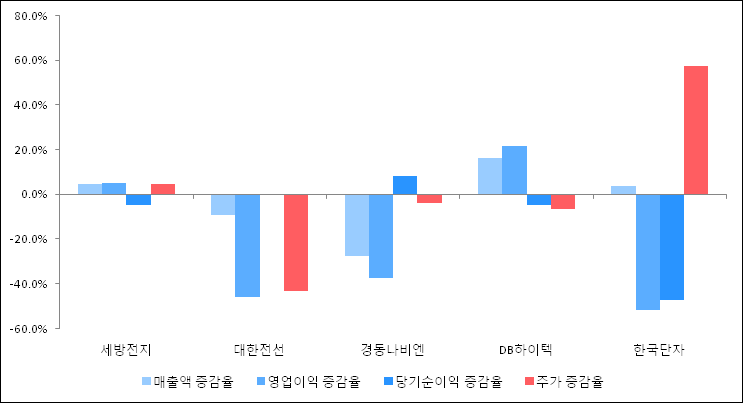 다음은 세방전지와 동일 업종 내 비교 그룹 종목의 각각 최근 실적의 전년 동기 대비 성장률이다. 세방전지의 매출액 증감율은 타 종목 대비 우수한 편이다. 그리고 주가 상승률은 높은 편이다.