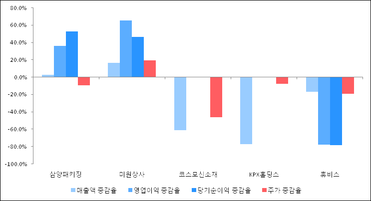 다음은 삼양패키징과 동일 업종 내 비교 그룹 종목의 각각 최근 실적의 전년 동기 대비 성장률이다. 삼양패키징의 매출액 증감율은 타 종목 대비 우수한 편이다. 그리고 주가는 하락하였지만 하락율이 비교적 크지는 않았다.