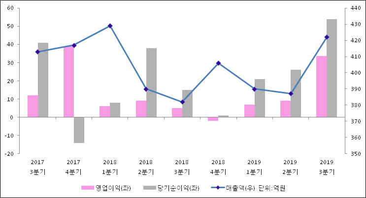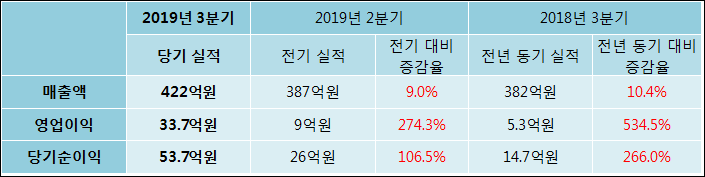 11월 14일 에스제이엠홀딩스(025530)의 2019년 3분기 연결 확정 실적이 발표됐다. 전년 같은 기간 대비해서 매출액, 영업이익, 당기순이익 모두 증가하였다. 382억원이었던 매출액은 10.4% 증가하여 422억원을 기록했다. 영업이익은 534.46% 상승하여 33.7억원이고, 당기순이익은 53.7억원으로 발표됐다.