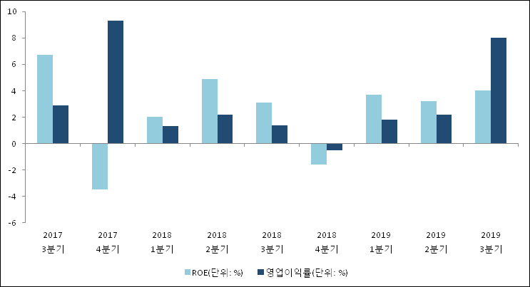 이번분기 기준으로 추정되는 에스제이엠홀딩스의 자기자본이익률(ROE)은 4%로 나타났다. 전년 동기인 2018년 3분기 ROE는 3.1%로 이번 분기에 0.9%p 상승했다. 한편 동종목의영업이익률은 8%이다. 이는 최근 일년과 비교했을 때 급등하였다. 3분기 매출액, 영업이익 모두 상승했는데, 영업이익의 상승폭이 더 컸기 때문에 영업이익률이 상승했다. 지난해 동기 영업이익률은 1.4%로 이번 3분기가 6.6%p 상승했다.