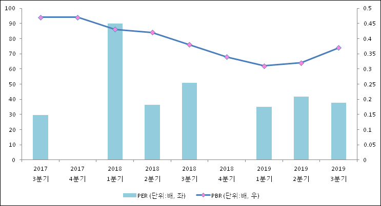 주가가 1주당 수익의 몇배가 되는지 나타내는 주가수익비율(PER)은 37.8배로 나타났다. 전년 동기 PER은 50.99배로 이번 분기에 하락했다.주가가 1주당 순자산의 몇배인지 알려주는 주가순자산비율인 PBR은 0.37배이다. PBR은 5분기 이상 연속으로 하락하다 저번 분기부터 반등하여 상승했다. 지난해 동기 PBR은 0.38배로 이번 분기와 비슷한 수치이다.