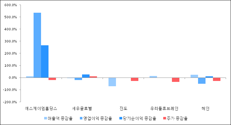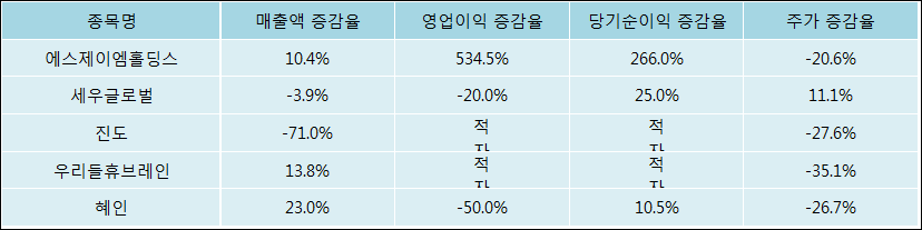 다음은 에스제이엠홀딩스와 동일 업종 내 비교 그룹 종목의 각각 최근 실적의 전년 동기 대비 성장률이다. 에스제이엠홀딩스의 매출액 증감율은 타 종목 대비 양호한 편이다. 그리고 주가는 하락하였지만 비교적 적은 하락율을 보였다.
