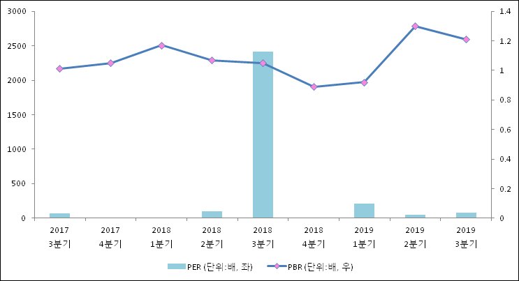 주가가 1주당 수익의 몇배가 되는지 나타내는 주가수익비율(PER)은 77.1배로 나타났다. 전년 동기 PER은 2410배로 이번 분기에 하락했다.주가가 1주당 순자산의 몇배인지 알려주는 주가순자산비율인 PBR은 1.21배이다. 지난해 동기 PBR은 1.05배로 이번 3분기 PBR이 상승했다.