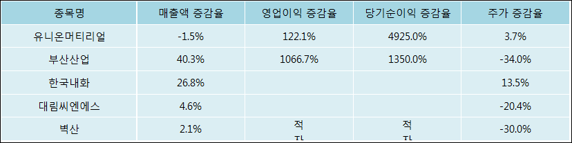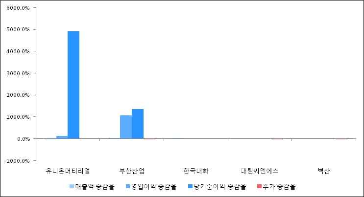 다음은 유니온머티리얼과 동일 업종 내 비교 그룹 종목의 각각 최근 실적의 전년 동기 대비 성장률이다. 유니온머티리얼의 매출액 증감율은 타 종목 대비 가장 저조한 편이다. 그리고 주가 상승률은 높은 편이다.