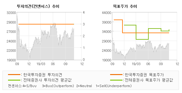 한국투자증권의 동종목에 대한 최근 1년동안의 투자의견은 전체적으로 큰 변화없이 유지되고 있다. 목표주가는 2018년10월 40,000원까지 높아졌다가 2018년12월 33,000원을 최저점으로 목표가가 제시된 이후 최근에도 33,000원으로 제시되고 있다.