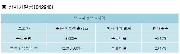 상지카일룸(042940)은 12일 최대주주 (주)씨지아이홀딩스를 비롯한 특별관계자의 보유주식이 감소되었다고 발표했다. 이는 직전 보고일보다 8,000주 증가하여 지분율은 26.17%로 상승했다. 이번 보고 사유는 변동사유:특관자주식일부장내매수,제3자보유전환사채전환청구행사로인한발행주식총수증가외변경사유:보고자보유주식담보제공계약만기연장에 따른 담보계약변경로 알려졌다.