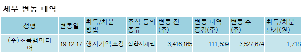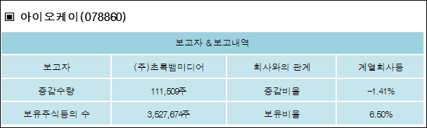아이오케이(078860)는 18일 계열회사등 (주)초록뱀미디어의 보유주식이 증가되었다고 발표했다. 이는 직전 보고일보다 111,509주 증가하여 지분율은 6.5%로 상승했다. 이번 보고 사유는 제12회전환사채전환가액조정으로 알려졌다.