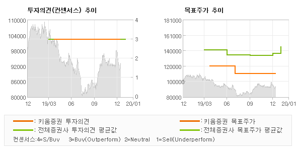 키움증권의 동종목에 대한 최근 9개월 동안의 투자의견은 전체적으로 큰 변화없이 유지되고 있다. 목표주가는 2019년4월 120,000원까지 높아졌다가 2019년7월 110,000원을 최저점으로 목표가가 제시된 이후 최근에도 110,000원으로 제시되고 있다.