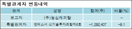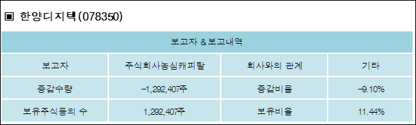한양디지텍(078350)은 13일 기타 주식회사농심캐피탈을 비롯한 특별관계자의 보유주식이 감소되었다고 발표했다. 이는 직전 보고일보다 1,292,407주 감소하여 지분율은 11.44%로 하락했다. 이번 보고 사유는 전환사채매도청구권행사에 따른 매각으로 알려졌다.