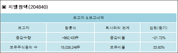 지엘팜텍(204840)은 31일 임원(등기) 왕훈식을 비롯한 특별관계자의 보유주식이 감소되었다고 발표했다. 이는 직전 보고일보다 862,433주 감소하여 지분율은 33.63%로 하락했다. 이번 보고 사유는 보고자및특별관계자유상증자신주취득에 따른 변동으로 알려졌다.