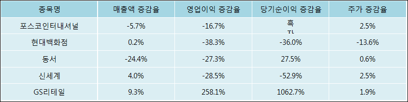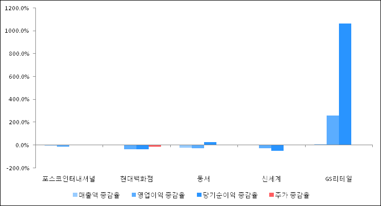 다음은 포스코인터내셔널과 동일 업종 내 비교 그룹 종목의 각각 최근 실적의 전년 동기 대비 성장률이다. 포스코인터내셔널의 매출액 증감율은 타 종목 대비 저조한 편이다. 그리고 주가 상승률은 높은 편이다.