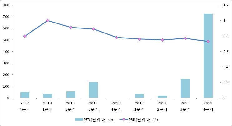주가가 1주당 수익의 몇배가 되는지 나타내는 주가수익비율(PER)은 725.7배로 나타났다. 직전분기 PER은 161.86배로 이번 분기에 상승했다.주가가 1주당 순자산의 몇배인지 알려주는 주가순자산비율인 PBR은 0.73배이다. 지난해 동기 PBR은 0.78배로 이번 분기와 비슷한 수치이다.