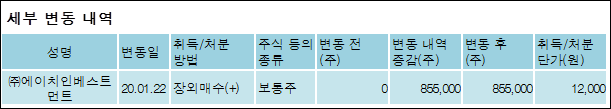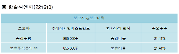 한솔씨앤피(221610)는 31일 주요주주 ㈜에이치인베스트먼트의 보유주식이 증가되었다고 발표했다. 이는 직전 보고일보다 855,000주 증가하여 지분율은 21.41%로 상승했다. 이번 보고 사유는 주식및경영권양수도계약체결에 따른 신규보고로 알려졌다.