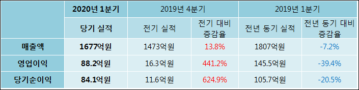 4월 21일 에코프로비엠(247540)의 2020년 1분기 연결 잠정 실적이 발표됐다. 매출액, 영업이익, 당기순이익 모두 전년 같은 기간 대비해서 감소하였다. 매출액은 7.2% 감소한 1677억원으로 발표됐다. 영업이익은 39.4% 줄어들어 88.2억원을, 당기순이익은 20.5% 하락한 84.1억원을 기록하였다.