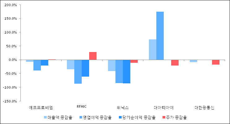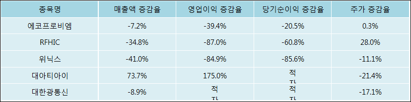 다음은 에코프로비엠과 동일 업종 내 비교 그룹 종목의 각각 최근 실적의 전년 동기 대비 성장률이다. 에코프로비엠의 매출액은 감소했지만 증감율은 타 종목 대비 우수한 편이다. 그리고 주가 상승률은 높은 편이다.