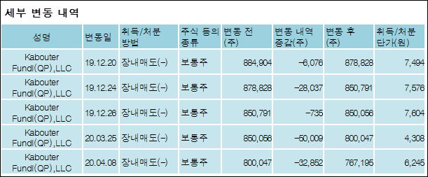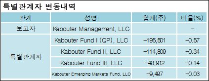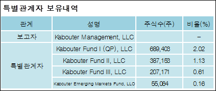 KabouterManagement,LLC를 비롯한 특별관계자의 보유주식이 감소되었다고 발표했다. 이는 직전 보고일보다 368,719주 감소하여 지분율은 3.92%로 하락했다. 이번 보고 사유는 보유비율변동으로 알려졌다.