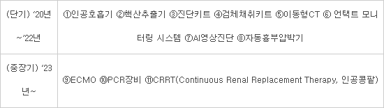 코로나19 재유행에 대비해 인공호흡기·에크모(ECMO) 등 중증환자 치료용 핵심 치료기기와 개인보호구를 확보·비축한다. 고글 등 국산 방역물품의 기능개선도 돕는다. 핵심기술의 국산화가 가능하고 세계 시장 경쟁력이 높은 11대 전략 의료기기 품목도 선정, 맞춤형 지원을 추진한다.