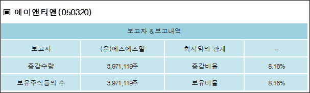 에이앤티앤(050320)은 05일 - (유)에스에스알의 보유주식이 증가되었다고 발표했다. 이는 직전 보고일보다 3,971,119주 증가하여 지분율은 8.16%로 상승했다. 이번 보고 사유는 전환사채권취득으로 알려졌다.