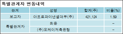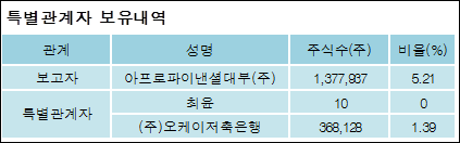 리드코프(012700)는 05일 주주 아프로파이낸셜대부(주)를 비롯한 특별관계자의 보유주식이 증가되었다고 발표했다. 이는 직전 보고일보다 421,124주 증가하여 지분율은 6.6%로 상승했다. 이번 보고 사유는 1%변동보고로 알려졌다.