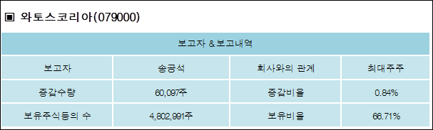 [ET투자뉴스][와토스코리아 지분 변동] 송공석 외 8명 0.84%p 증가, 66.71% 보유
