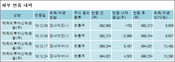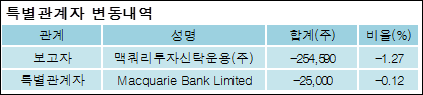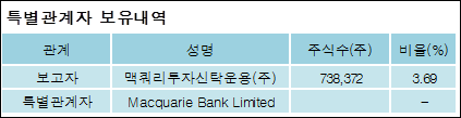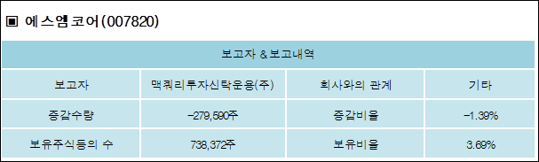 에스엠코어(007820)는 18일 기타 맥쿼리투자신탁운용(주)를 비롯한 특별관계자의 보유주식이 감소되었다고 발표했다. 이는 직전 보고일보다 279,590주 감소하여 지분율은 3.69%로 하락했다. 이번 보고 사유는 주식장내매매에의한변동보고로 알려졌다.
