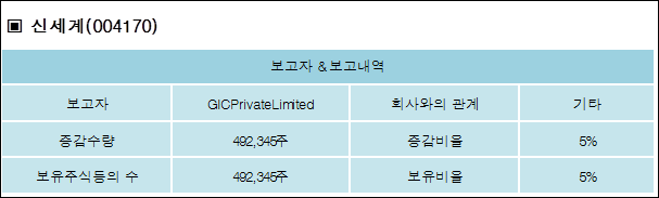 신세계(004170)는 22일 기타 GICPrivateLimited의 보유주식이 증가되었다고 발표했다. 이는 직전 보고일보다 492,345주 증가하여 지분율은 5.001%로 상승했다. 이번 보고 사유는 단순주식취득에의한5%신규보고로 알려졌다.