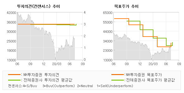 NH투자증권의 동종목에 대한 최근 1년동안의 투자의견은 전체적으로 큰 변화없이 유지되고 있다. 목표주가는 2019년7월 58,000원까지 높아졌다가 2020년4월 27,000원을 최저점으로 목표가가 제시된 이후 최근에 31,000원으로 새롭게 조정되고 있다.