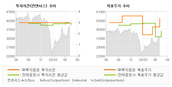 오늘 NH투자증권에서 발표된 'BUY(유지)'의견 및 목표주가 55,000원은 전체 컨센서스 대비해서 대체적으로 평균치에 해당하는 수준으로, 이번 의견은 동종목에 대한 전체적인 흐름에서 크게 벗어나지 않은 것으로 파악되며 목표가평균 대비 25.4% 초과하고 있는 것으로 집계되었다. 참고로 최근 증권사 매매의견 중에서 제일 보수적인 의견을 제시한 유진투자증권은 투자의견 'HOLD'에 목표주가 37,000원을 제시한 바 있다.
